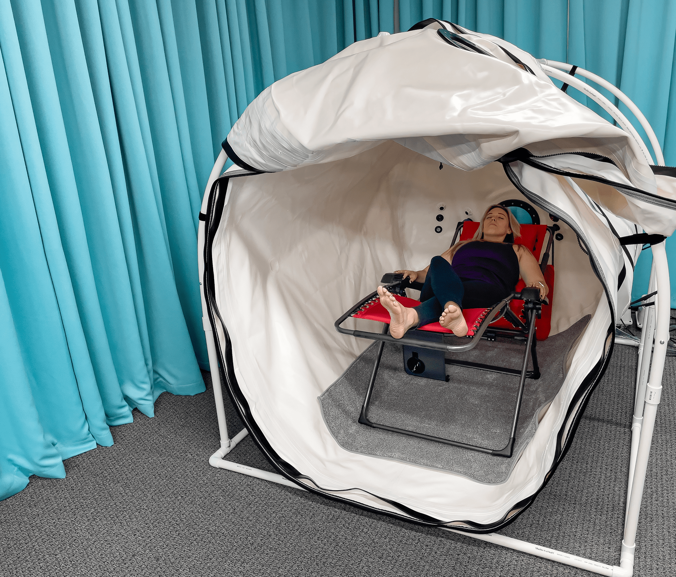 The Summit to Sea 60″ Grand Dive Pro Plus is the most spacious mild hyperbaric chamber available today—designed with advanced accessibility, clinical flexibility, and user comfort in mind. With a generous 60″ diameter and 8.5-foot length, this chamber easily accommodates wheelchairs, a real recliner, or two adults seated comfortably.